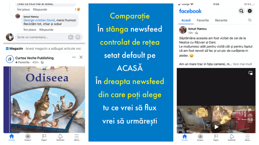 Ceea ce era odată newsfeed acum e un flux separat în trei categorii distincte, care funcționează automat pe culoarul ACASĂ – respectiv acolo unde Facebook îți prezintă ce vrea, adică reclame și postări care fac să vezi lumea în alb negru. Nu-i ușor să ieși din mincinosul-acasă și să ajungi la cel adevărat. Trebuie să faci o mișcare de scroll – down, apoi una de scroll -up și abia atunci apar ca prin magie, în partea de sus celelalte categorii – RECENTE și FAVORITE.