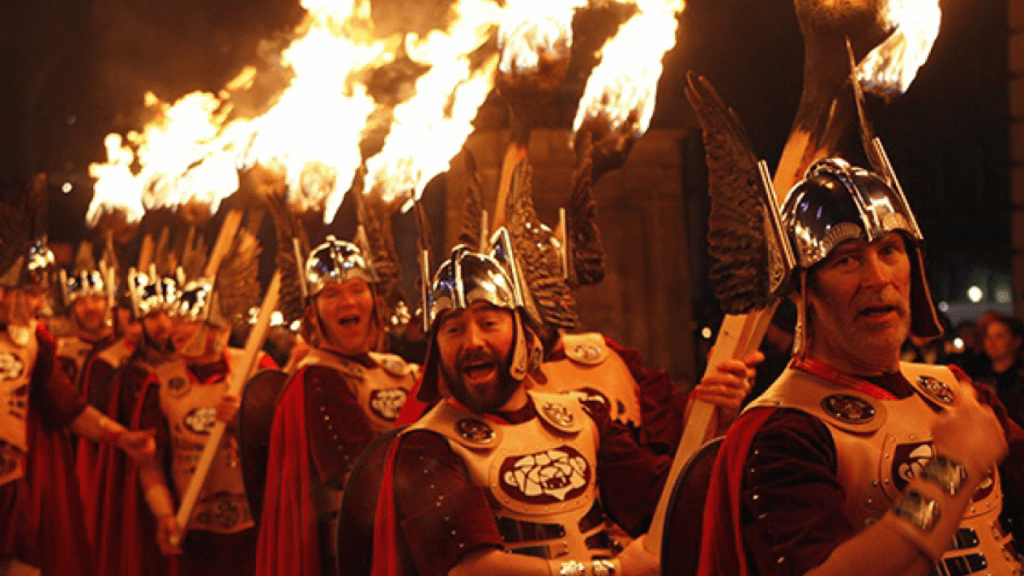 De Hogmanay, cuvântul scoțian pentru ajunul noului an, în insulele Shetland au loc festivalurile tradiționale de foc Up Helly Aa. În restul țării, obiceiul arderii făcliilor poartă numele Hogmanay. Sărbătoarea a luat amploare atunci când liderii religioși au expulzat Crăciunul din Scoția, din cauza diferendelor religioase. Neputând celebra Crăciunul aproape 400 de ani, mulți au făcut din Hogmanay sărbătoarea cea mai mare.
