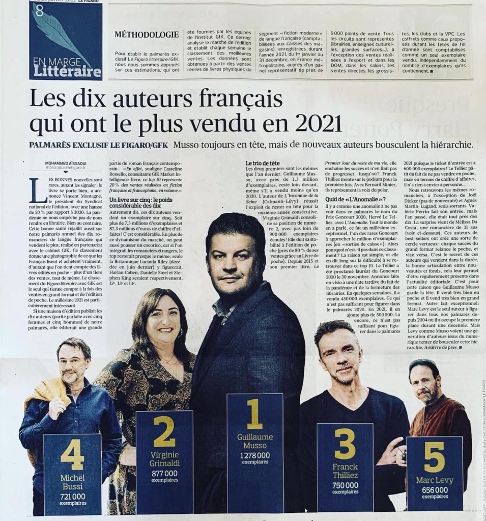 Al treilea cel mai apreciat scriitor de ficțiune este Franck Thilliez (750.000 de exemplare vândute) şi Michel Bussi (721.000 de exemplare). Urmează şase autori care se situează între 600.000 şi 656.000 de exemplare: Marc Levy, Bernard Minier, Valérie Perrin, Mélissa Da Costa (nouă intrată în acest top 10), Marie-Bernadette Dupuy şi Aurélie Valognes.