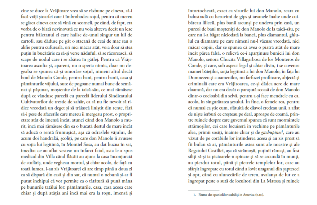 O astfel de comunitate, închisă și impermeabilă, este La mantosa, locul din care sătenii iau pe rând cuvântul ca să ne spună povestea Vrăjitoarei și a celui (celei / celor?) care a/u ucis-o… Oare pentru banii din pereți? Vom afla sau ba, dar înainte de asta citim despre istoria Vrăjitoarei și cu ce se ocupă dânsa atunci când nu le face ceaiuri de avort fetelor de treișpe ani. V-am zis că e de speriat cartea, credeați că glumesc? Dar ca să aflăm toate acestea, și multe altele petrecute pe întuneric și pe furiș în La Mantosa, plecăm într-un voiaj cu multe stații prin viețile personajelor care au văzut-o ultima oară vie pe cea al cărui nume nu-l cunoaște nimeni. Pentru că a existat un martor al crimei și acesta s-a dus imediat la șeful de post și a spus tot.