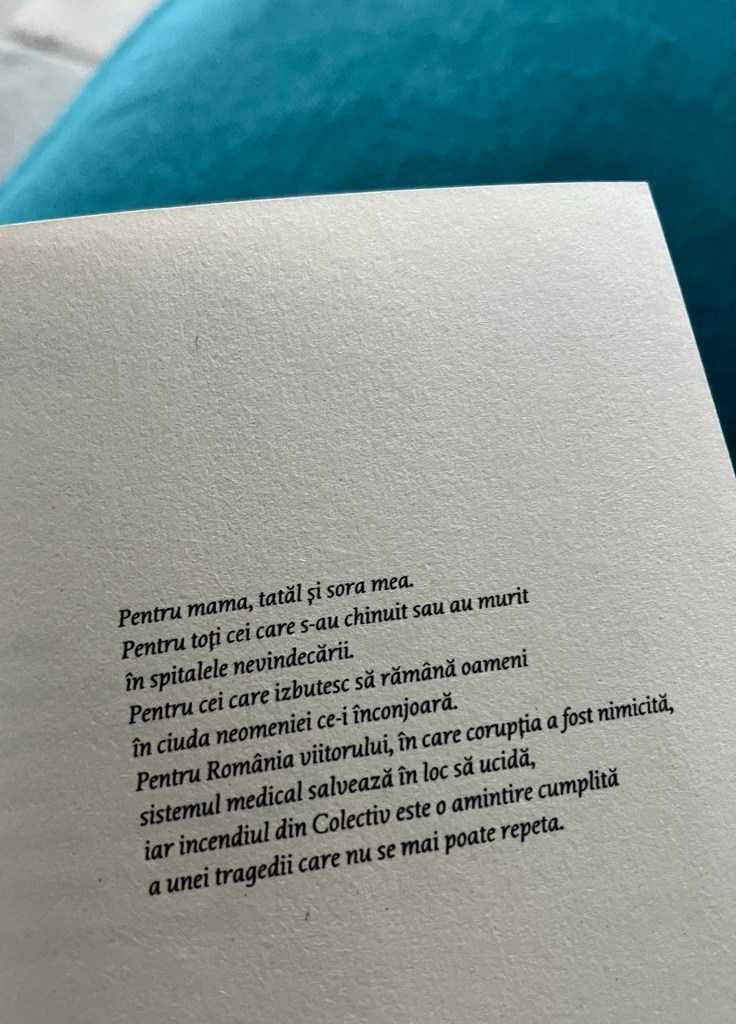 Felicitări și editurii Humanitas pentru carte. În lipsa ei probabil, an după an, Colectiv ni s-ar fi estompat – cum spunea Alexandra aseară – încet, dar inevitabil în memorie. Ca orice altă suferință, peste care ne spunem că e mai ușor să “trecem”, dacă nu ne-o amintim. Colectiv este una dintre traumele naționale peste care nu avem voie să trecem. Nu înainte să fi schimbat ceva, în noi, în societate, în spitale, în ministere, în birourile care dau avizele pentru orice! Altminteri, focul nimicitor care ardea mocnit cu mult înainte de Colectiv, cel alimentat de combustibilul corupției, nepăsării și blazării, mai pe scurt răul va continua să ardă nestingherit fiecare “grăunte de bine din noi”.