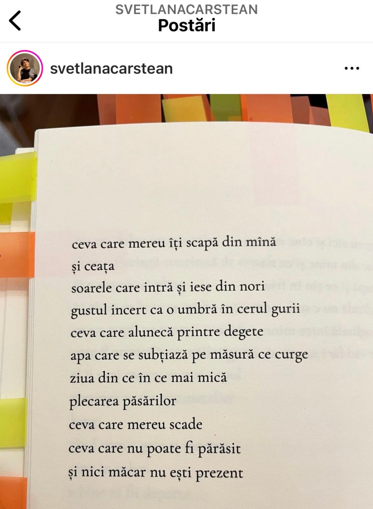 „Dacă aș semna regia unui film după Sînt alta, aș porni de la un anumit cadru: imaginea unei contorsioniste care își exersează mișcările în oglindă, oasele reliefându-se prin piele, frumusețea corpului imun la durere. Despre asta e vorba în noul volum al Svetlanei Cârstean, despre o abordare frontală a propriei identități, despre apropierea de sine prin îndepărtare, despre deteritorializarea traumei și a spaimelor pe care oamenii le poartă cu ei peste tot, oricât de mult s-ar îndepărta, în timp și spațiu, de momentul în care le-au trăit.“