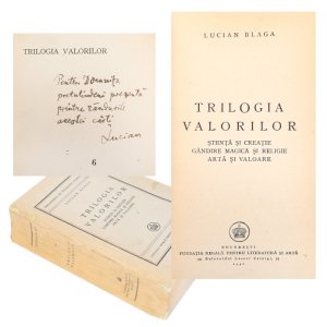 Ediția princeps a Trilogiei valorilor a lui Lucian Blaga a apărut în 1946 la Fundația Regală pentru Literatură și Artă. Exemplarul acesta are o dedicație a autorului (“Pentru Domnița, pretutindeni prezentă printre rândurile acestei cărți…”) și provine dintr-o colecție privată. Cartea s-a vândut cu 600 de euro.