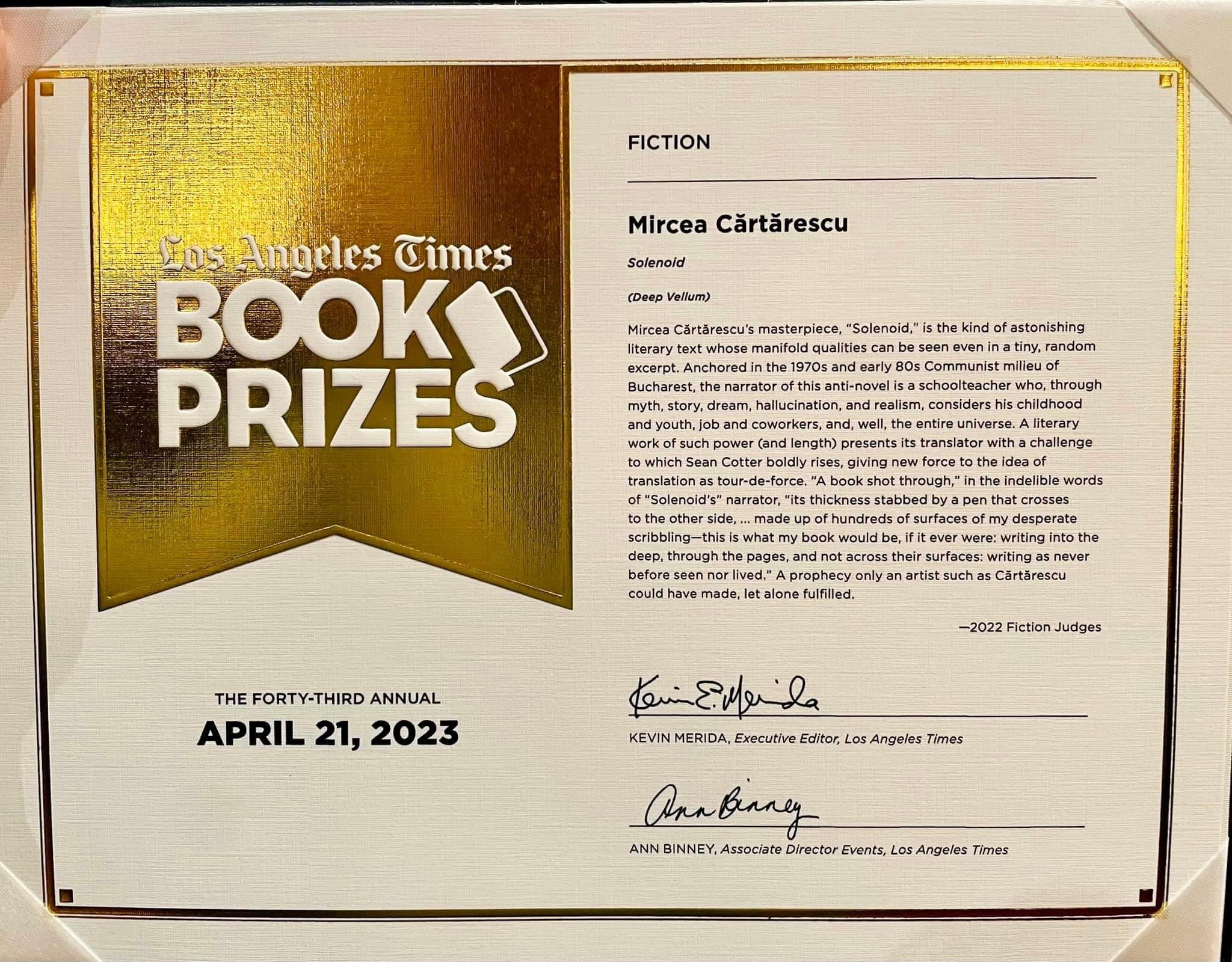 BREAKING Mircea Cărtărescu a câștigat Los Angeles Times Book Prize la categoria Ficțiune cu romanul Solenoid