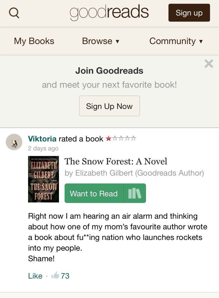 Mai mult de 500 de utilizatori Goodreads au acordat o stea cărții pe platforma de recenzii. Mulți dintre ei au spus că sunt ucraineni și sunt îngrijorați că noul roman al lui Gilbert ar pune Rusia într-o lumină favorabilă, în contextul agresiunii împotriva Ucrainei și acuzațiilor de crime de război.