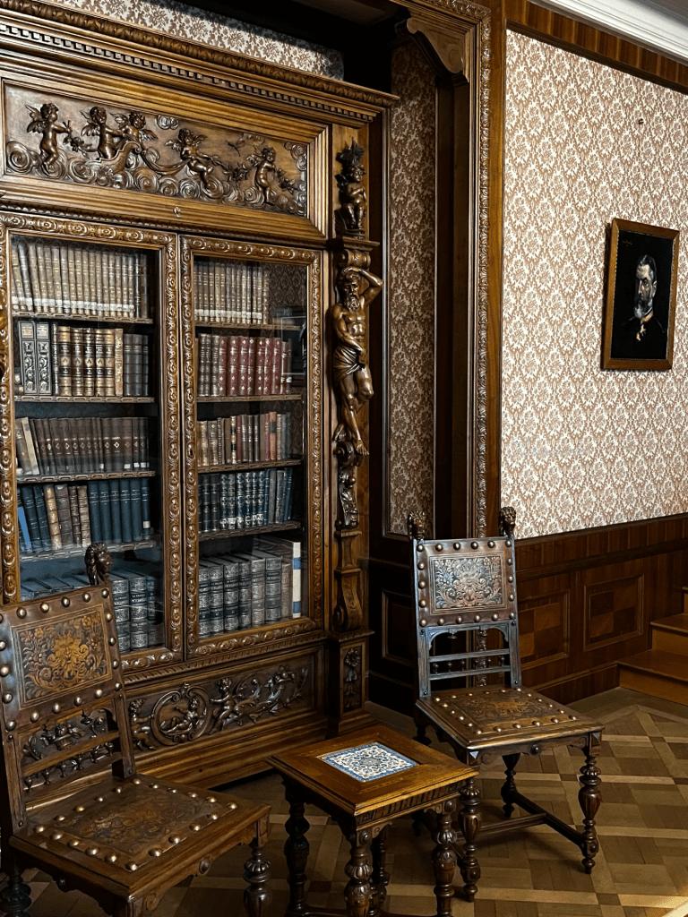 Un fapt pe care l-am remarcat cu admirație este că biblioteca Regelui nu este singura, ci doar cel mai mare spațiu destinat cărților și lecturii, dintre cele amenajate în camerele Palatului Cotroceni. O mică bibliotecă, aflată în partea stângă a Camerei Jocurilor, veghează măsuța la care doamnele obișnuiau să aștepte ca domnii să-și termine activitățile de relaxare – șah sau biliard.