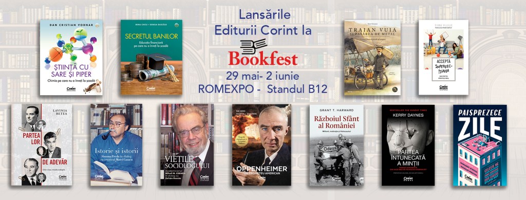Veți găsi Grupul Corint la standul B12, cu sute de titluri la promoție (noutățile Editurii Corint au o oră pe zi în care sunt reduse la jumătate din preț!). Programul integral al evenimentelor aici. Cititorii care vor participa la evenimentul organizat de Răsfoiala duminică, 2 iunie, ora 12, lângă scena Matca (Răsfoiești și câștigi), vor avea ocazia să câștige pachete de cărți oferite de Corint.