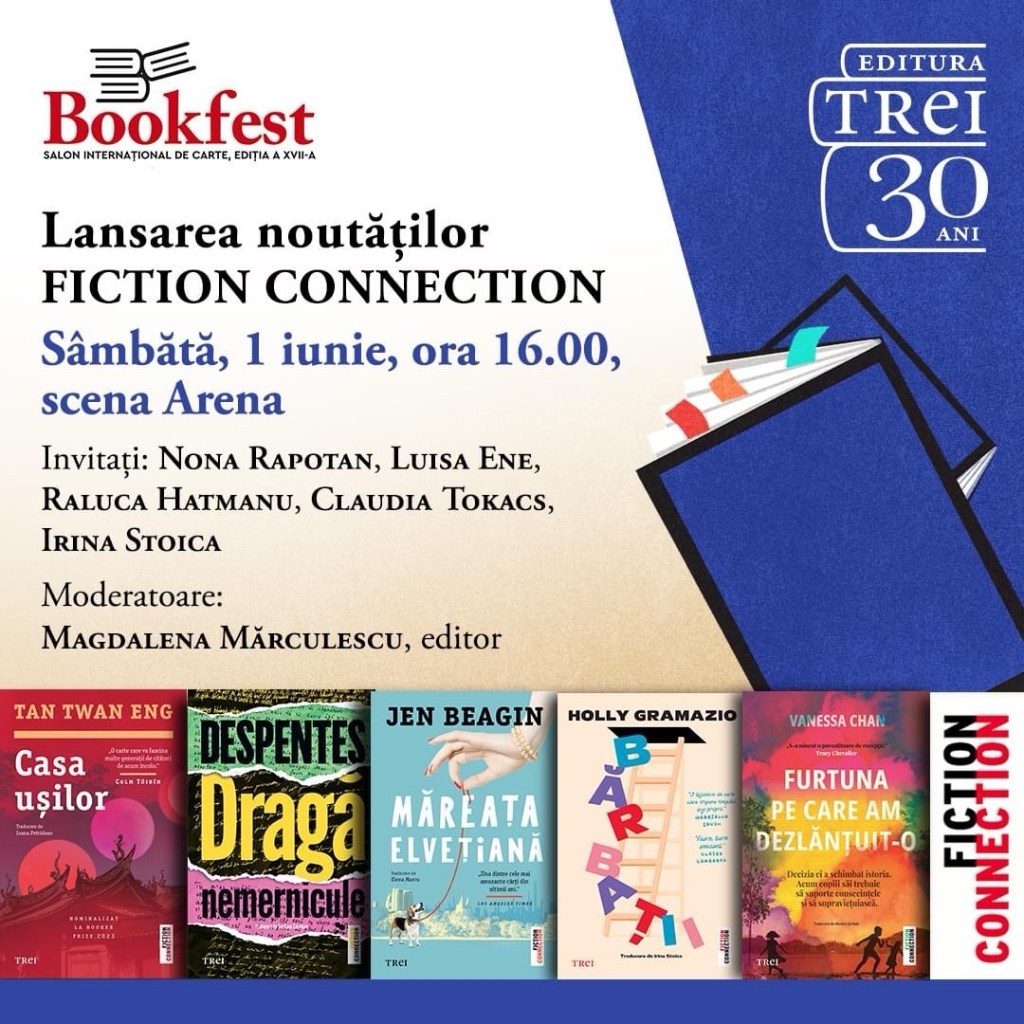Grupul Editorial Trei așteaptă cititorii cu 1.000 de titluri la 30% reducere, precum și o serie de cărți bune la 10 lei. Programul evenimentelor aici. Claudia Tokacs, fondatoarea proiectului Răsfoiala, va prezenta volumul Dragă nemernicule, de Virginie Despentes, în cadrul lansării noutăților Fiction Connection, sâmbătă, 1 iunie, de la 16:00, pe scena Arena.
