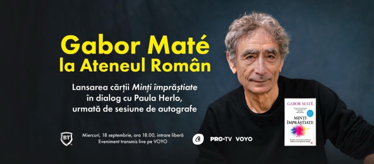 Miercuri, 18 septembrie 2024, la Ateneul Român, cu începere de la ora 18.00, va avea loc lansarea volumului „Minți împrăștiate”, cu Gabor Maté în rol principal, într-un dialog realizat de Paula Herlo. Celebrul medic va prezenta acest volum excepțional care dă speranță celor afectați de tulburarea de deficit de atenție. Intrarea la eveniment este liberă, Gabor Maté va fi pe scena Ateneului Român, în fața cititorilor și va oferi autografe la final, în foaier.