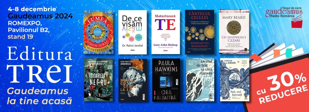 La ediția din iarna 2024 a Târgului de Carte Gaudeamus, care se va desfășura între 4-8 decembrie 2024 la centrul expozițional Romexpo, Grupul Editorial Trei aduce cititorilor zeci de titluri noi cu reducere, de la beletristică, la cărți pentru adolescenți și copiii și cărți de știință sau eseuri, cu reducere de 30% sau la preț special. Programul de vizitare a târgului găzduit de Pavilionul B2 Romexpo este de miercuri până duminică, orele 10.00 şi 20.00.
