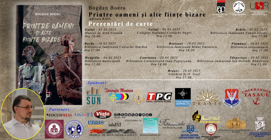 Romanul Printre oameni şi alte fiinţe bizare, cea mai recentă carte a scriitorului Bogdan Boeru, a apărut la editura Rao pe final de 2024 şi se găseşte deja în marile reţele de librării. Autorul şi cartea încep zilele acestea un turneu de prezentare în zece oraşe din ţară.