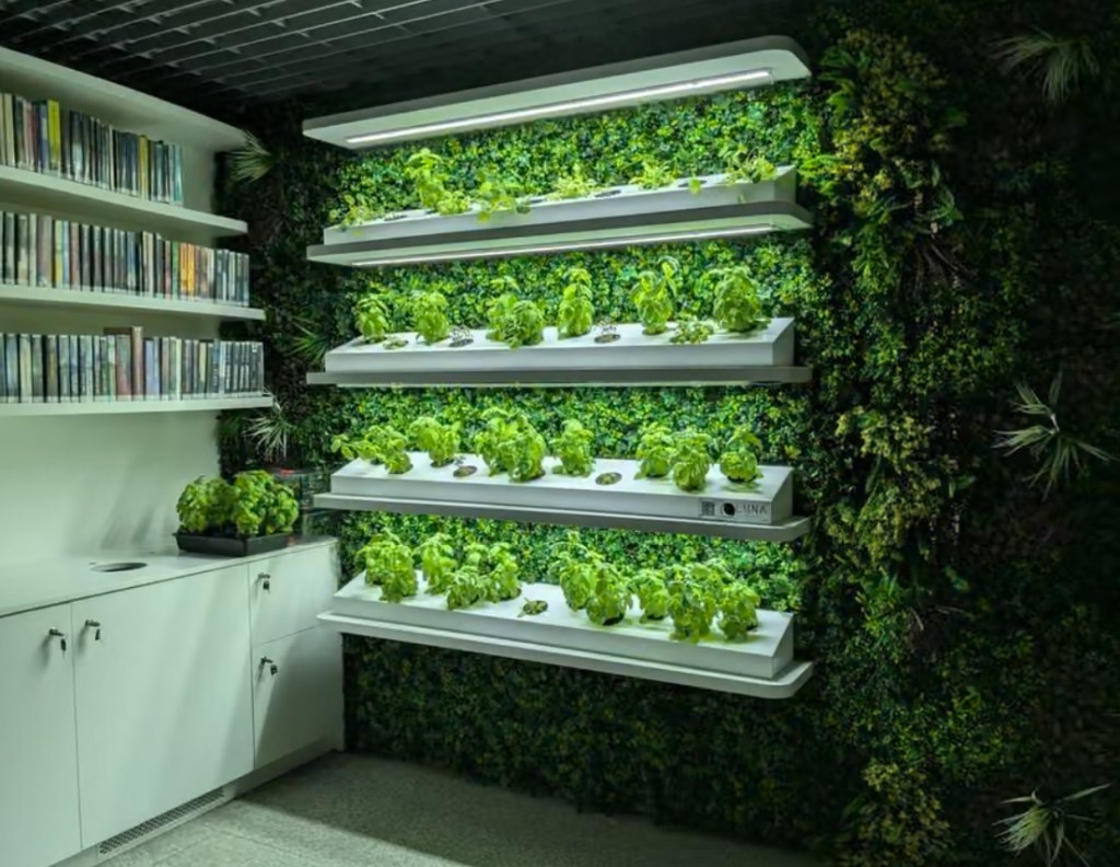 Peretele de grădină hidroponică funcționează fără lumină naturală sau sol pentru a cultiva ierburi aromatice, cum ar fi busuioc și oregano, și flori, inclusiv năsturei și panseluțe.