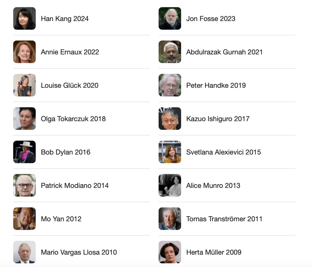 - este născut/-ă pe un alt continent (sau măcar în alt capăt al Europei) decât câștigătorul precedent (anul trecut Han Kang, autoare coreeană, cu un an înainte Jon Fosse, norvegian)