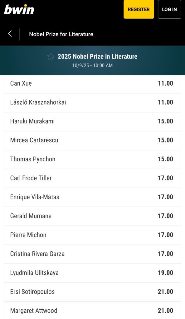 Pe al nostru l-am regăsit pe mai toate site-urile unde se fac pariuri pentru Nobelul literar, în reviste literare și în clipuri video ale scriitorilor care speră să intuiască următorul câștigător Nobel pentru literatură. Eu am tot sperat recent că acesta va fi Salman Rushdie, care aproape a plătit cu viața pentru aroganța de a fi liber în literatura, dar… se pare că nu e un criteriu relevant pentru comisia din Suedia.
