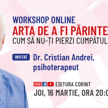 Editura Corint invită părinții la atelierul online Arta de a fi părinte. Cum să nu-ți pierzi cumpătul, prilejuit de lansarea volumului Cum să nu-ți pierzi cumpătul, de Carla Naumburg, carte care-i ajută să găsească soluțiile potrivite pentru a rezolva situațiile delicate de comunicare cu copii. Carla Naumburg identifică modalități eficiente prin care familiile pot gestiona … Mai mult EVENIMENT Workshop gratuit „Arta de a fi părinte. Cum să nu-ți pierzi cumpătul” cu psihoterapeutul Cristian Andrei